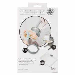 This hobby magnifier is a 3-in-1 LED lighted magnifer set. Crystal clear acrylic lenses and two super-bright LED lights ensure a crisp, bright-magnified image.Β To use, simply select one of the three included lenses and snap it into the base stand. The base stand allows you to use this as a free standing magnifier while the adjustable neck strap allows you to use hands free.Β You can also completely remove the lens and use the base as a book light.Β Requires 3 AAA batteries (not included).